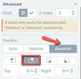 - Set the Position to Absolute. You will now see four placement options: top right, top left, bottom right, and bottom left. Choose a placement that fits your design.