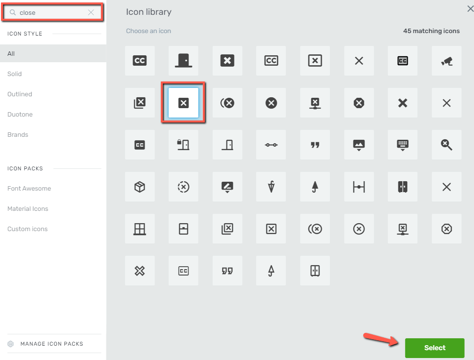 - Next, scroll through the available icon pack to find an icon that works as a close button. You can also type “close” in the search field to filter the results. After you’ve found the icon you want, select it and click on Select to add it to your form.