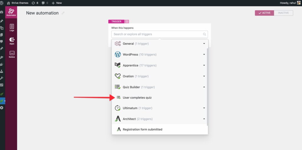 - Condition: Add a condition for “Quiz title” (select your quiz) and “Quiz result” (e.g., “Score is greater than 80%”).