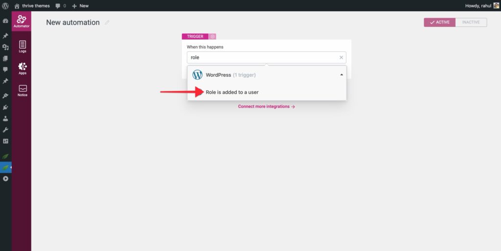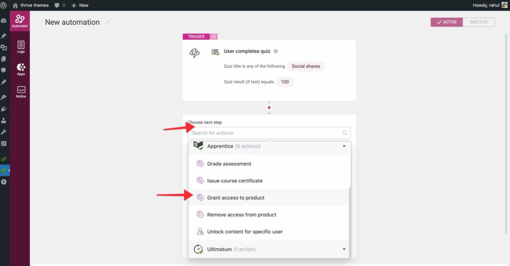 - Action: Select “Thrive Apprentice > Grant access to product” and choose your desired product.