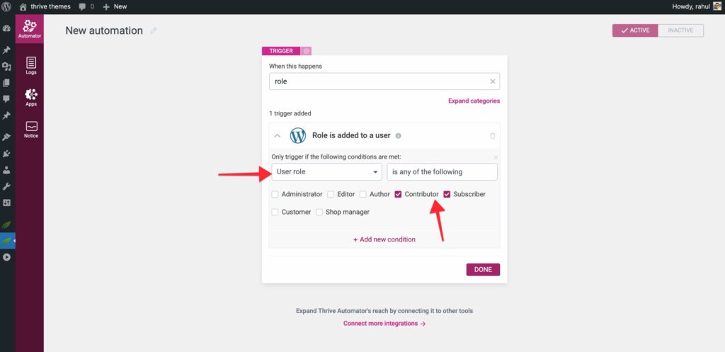 - Condition: Set the “User role” to the specific role that should trigger access (e.g., “Contributor” or “Member”).