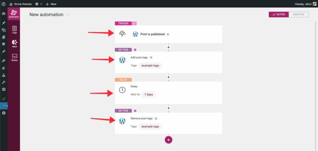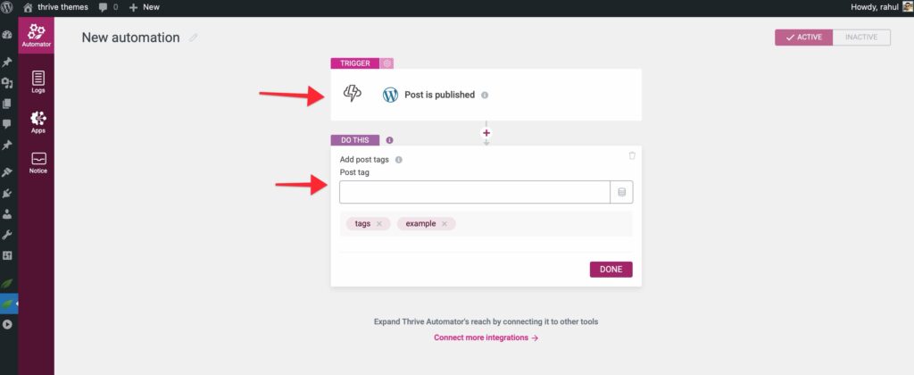 - Action 1: WordPress -> “Add post tags” (Tag: