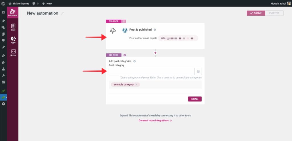 - Trigger: Thrive Automator -> “Registration form submitted”