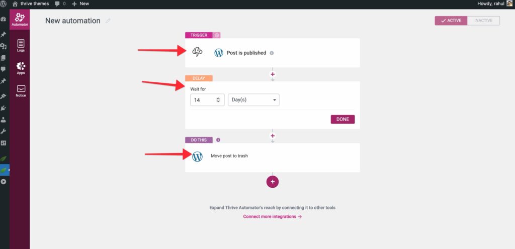 - Action 2: WordPress -> “Move post to trash”
