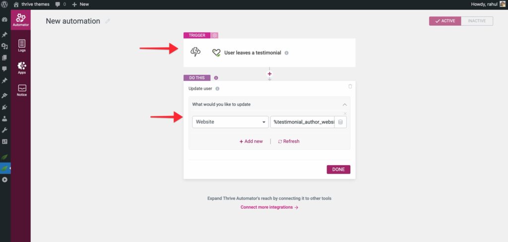 - Goal: Update a user’s WordPress profile (e.g., Website URL) when they submit a testimonial via Thrive Ovation.