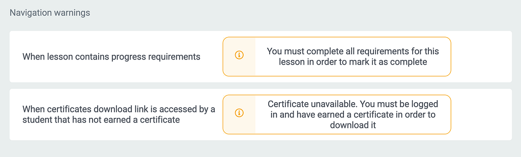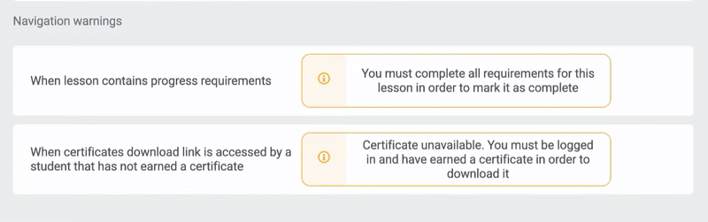 On the Course navigation page, scroll down to the Navigation warnings section where you’ll see the notifications set to be shown for the following two conditions.