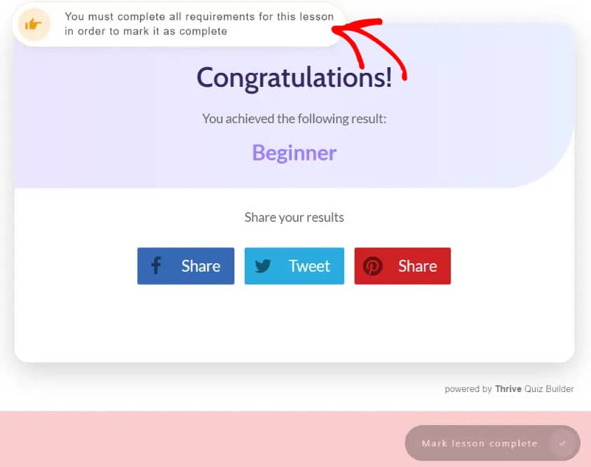 When the user clicks this button, it checks whether he has completed all the requirements to have completed the lesson, if not it displays a notice saying, You must complete all requirements for this lesson in order to mark it as complete.
