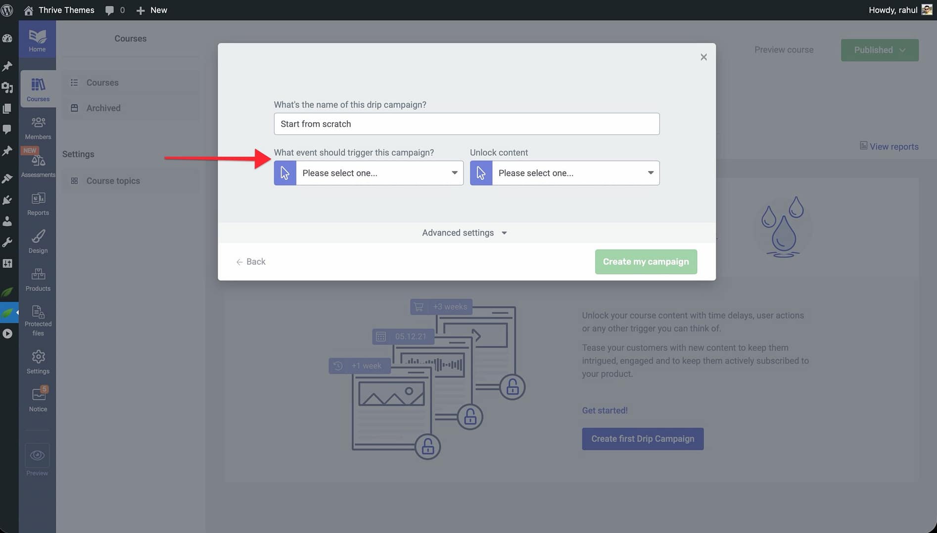 - Define the Trigger Event for the campaign—choose what initiates the drip timeline (e.g., product purchase, enrollment, or a custom automation event).