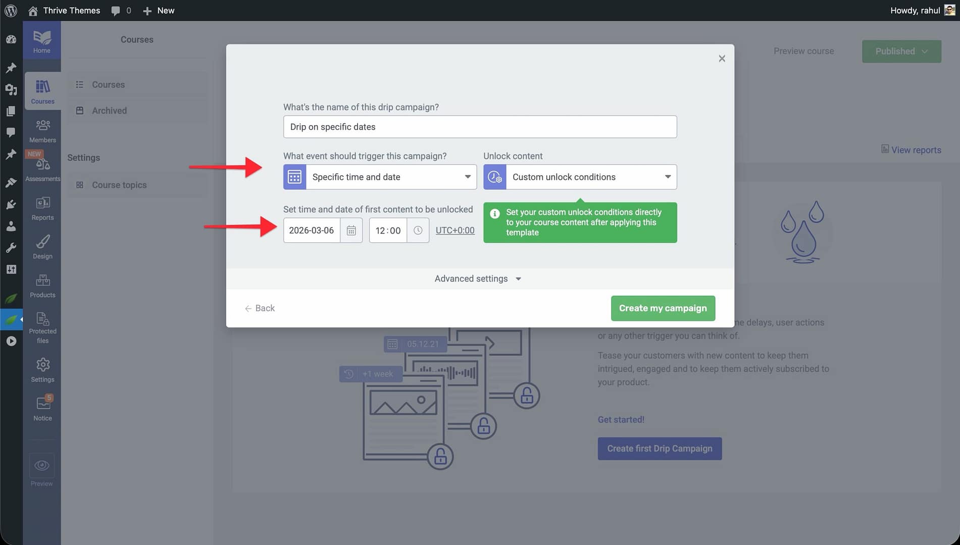 - For each lesson or module, configure individual unlock conditions: – Set a Time Delay (e.g., unlock 3 days after trigger). – Add a Completion Requirement (e.g., unlock after the student completes a specific previous lesson). – Assign a Custom Date if needed.
