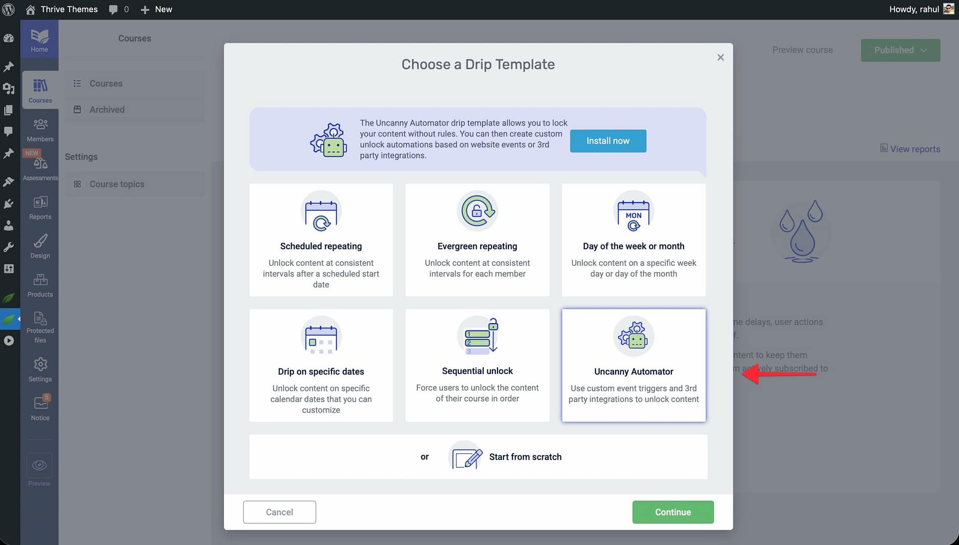 What it does: The Start From Scratch template provides a blank canvas with full control over every aspect of your drip campaign—trigger events, unlock intervals, and custom unlock conditions for each individual lesson. No predefined scheduling logic is applied.