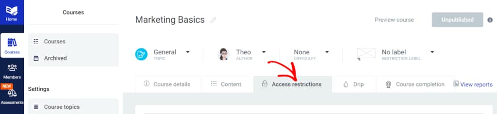 When you click on the course, you’ll be taken to a page where you’ll see the Course details. On this page, click the Access Restrictions tab.