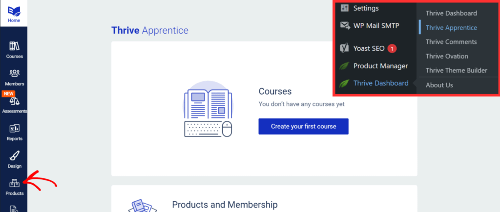 To configure a product’s access restrictions, open your WordPress admin area, navigate to Thrive Dashboard >> Thrive Apprentice, and click Products.