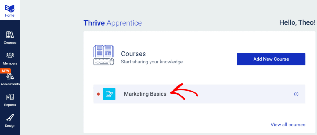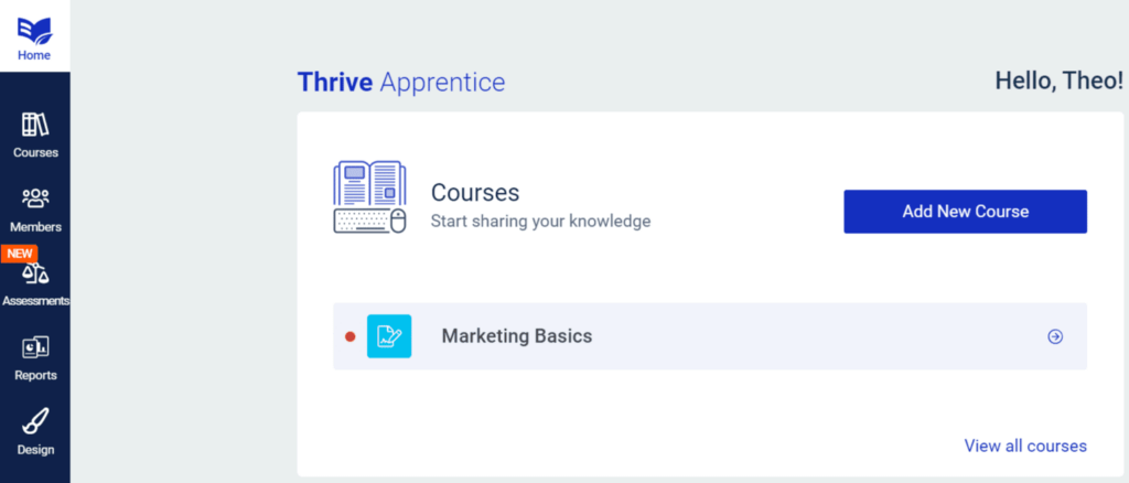 Another method of creating a Thrive Apprentice product is to access an already-created course on the Apprentice Course page or the Thrive Apprentice dashboard. In the Thrive Apprentice dashboard, you’ll see the already-created course, which you can click on to open, and an Add New Course button to create a new course.