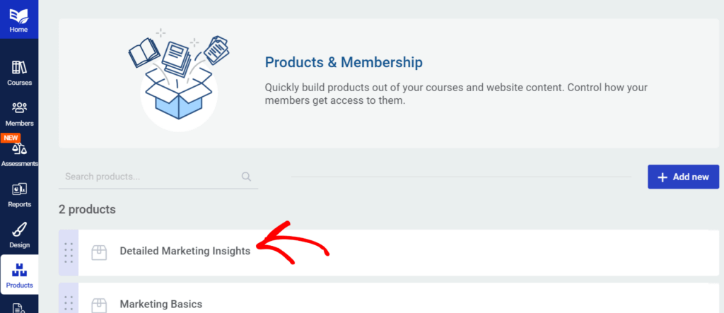 On the Course page, click on the course to which you’d like to add a product or click the Add New Course button to create a new course.