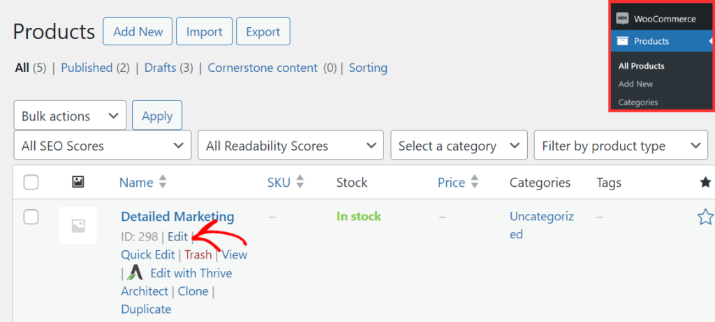 To fetch the product URL, open your WordPress admin area, navigate to Products >> All Products, and click Edit under the product name you want to access.