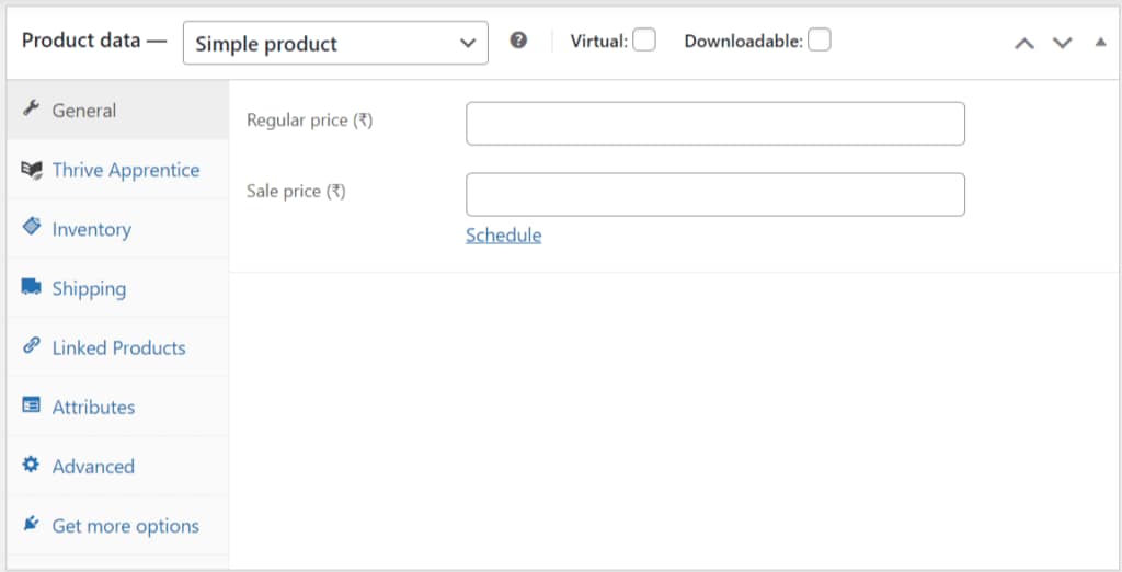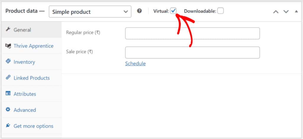 Furthermore, you can select whether your product is virtual or a downloadable open. Since you are offering a set of Thrive Apprentice courses, it is recommended that you select Virtual.