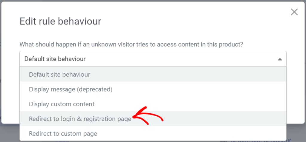 When you click this setting, a popup will appear where you can select what should happen if an unknown user tries to access the product’s content.