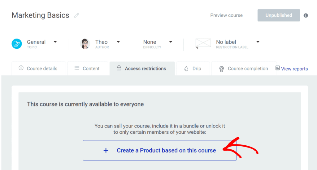 Under the Access Restrictions tab, click the “Create a Product based on this course” button.