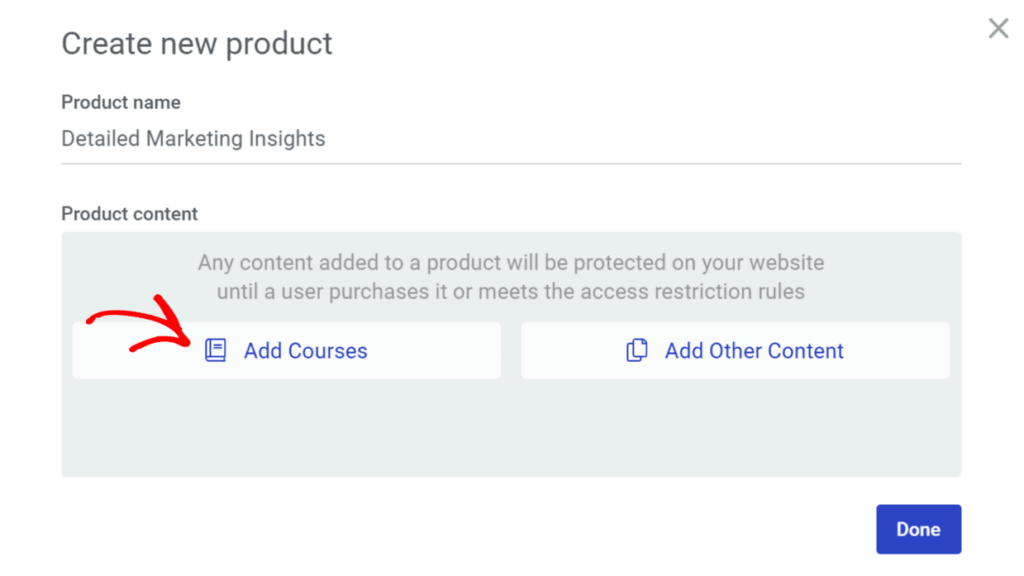 After clicking the button, you’ll see a popup where you can add the product name and any additional courses or content to be displayed under this product.