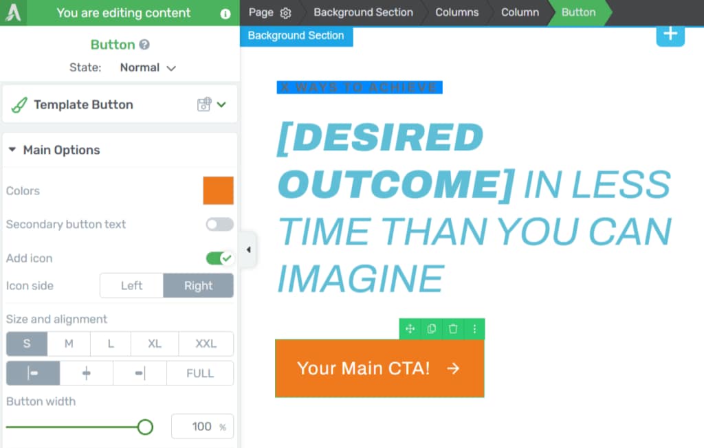 To begin, open the page in the Thrive Architect editor, scroll down to the call-to-action section, and click on the button to which you want to add the link. This will open the button’s Main Options in the left column.