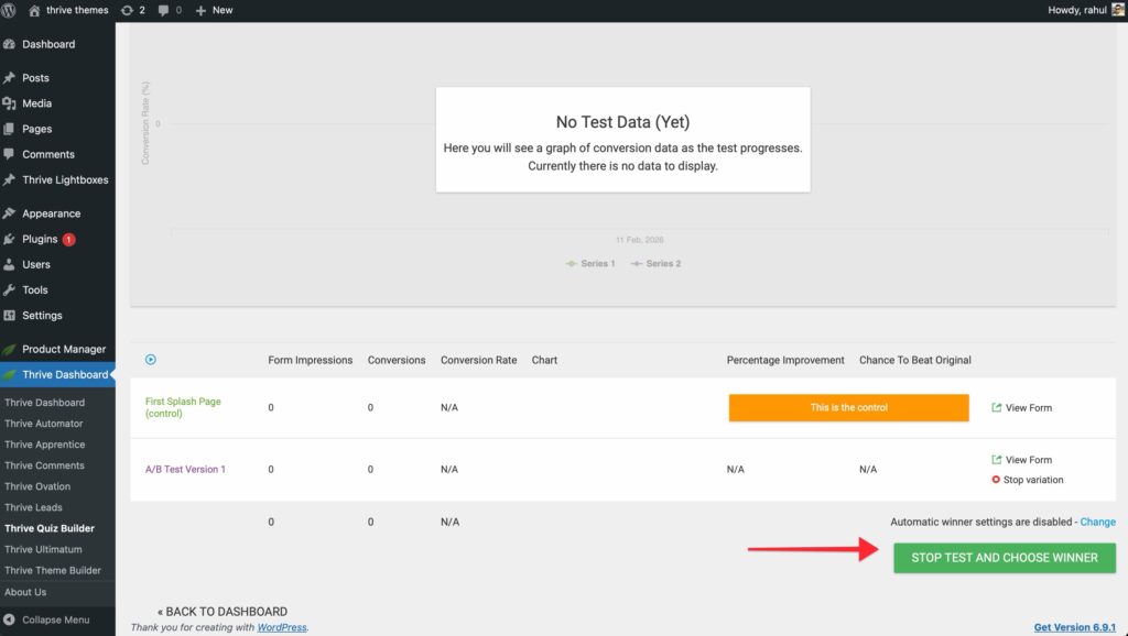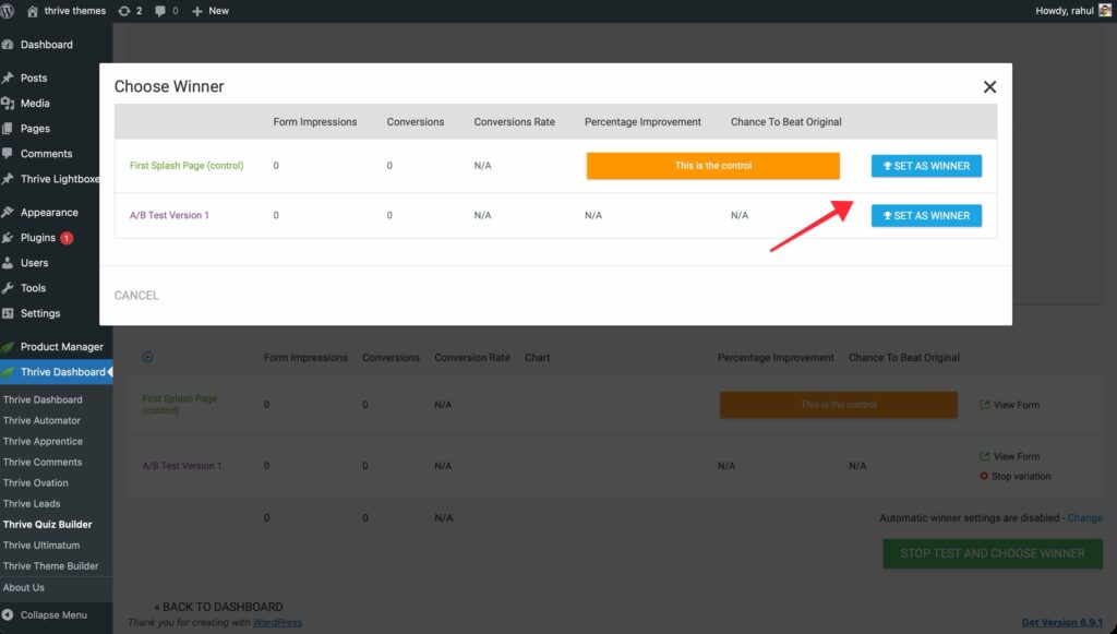 3. Click the Stop Test And Choose Winner button. Pick a winner from the popup.