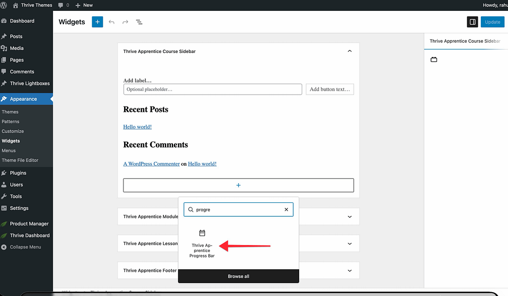 - Search for Thrive Apprentice Progress Bar and add it to the widget area.
