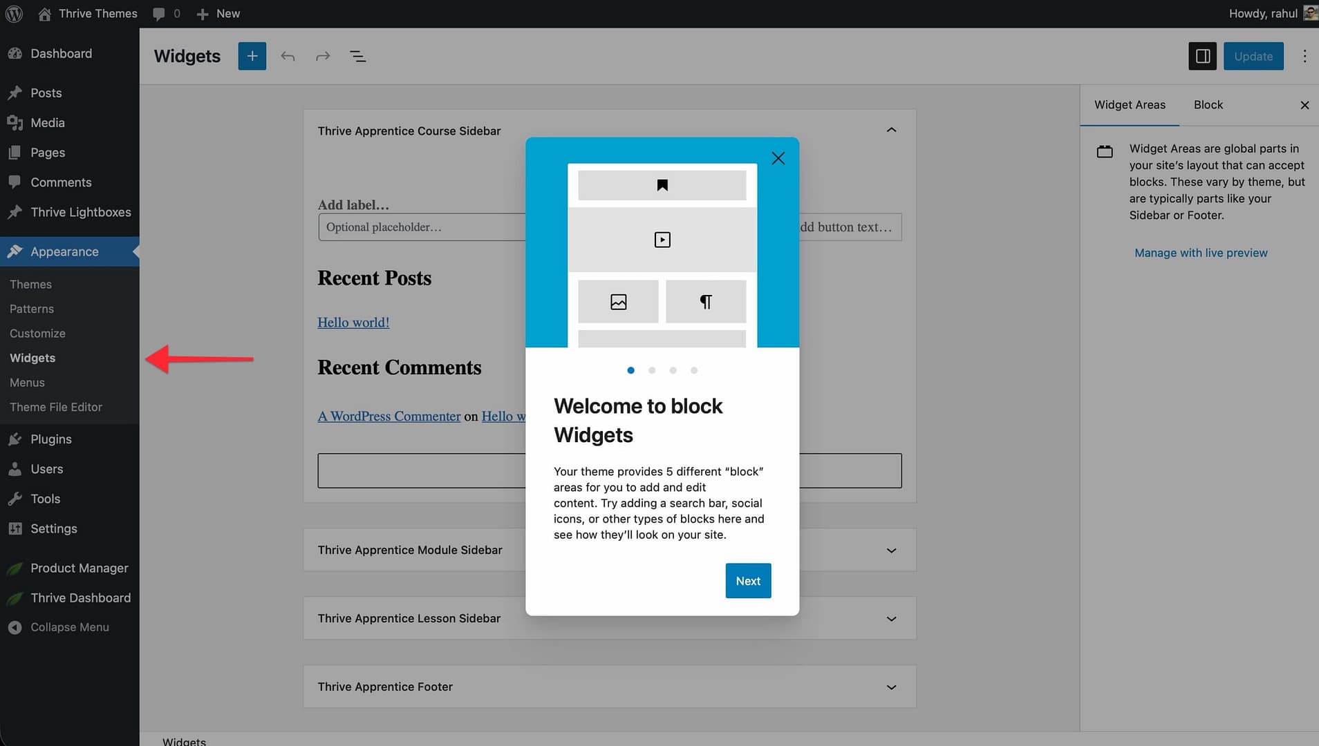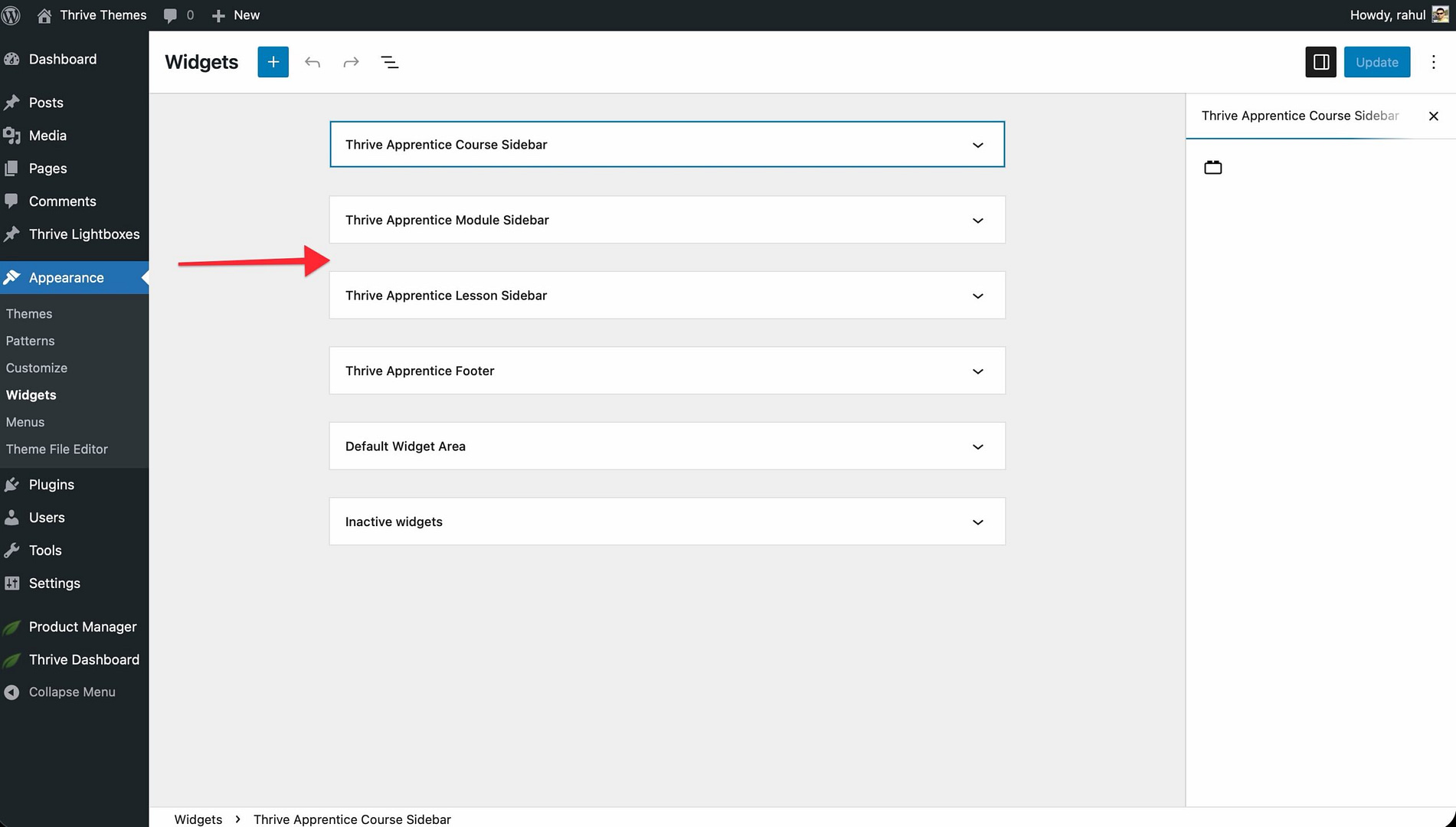 - Locate the Thrive Apprentice Sidebar widget area (or whichever widget area your theme uses for course pages).