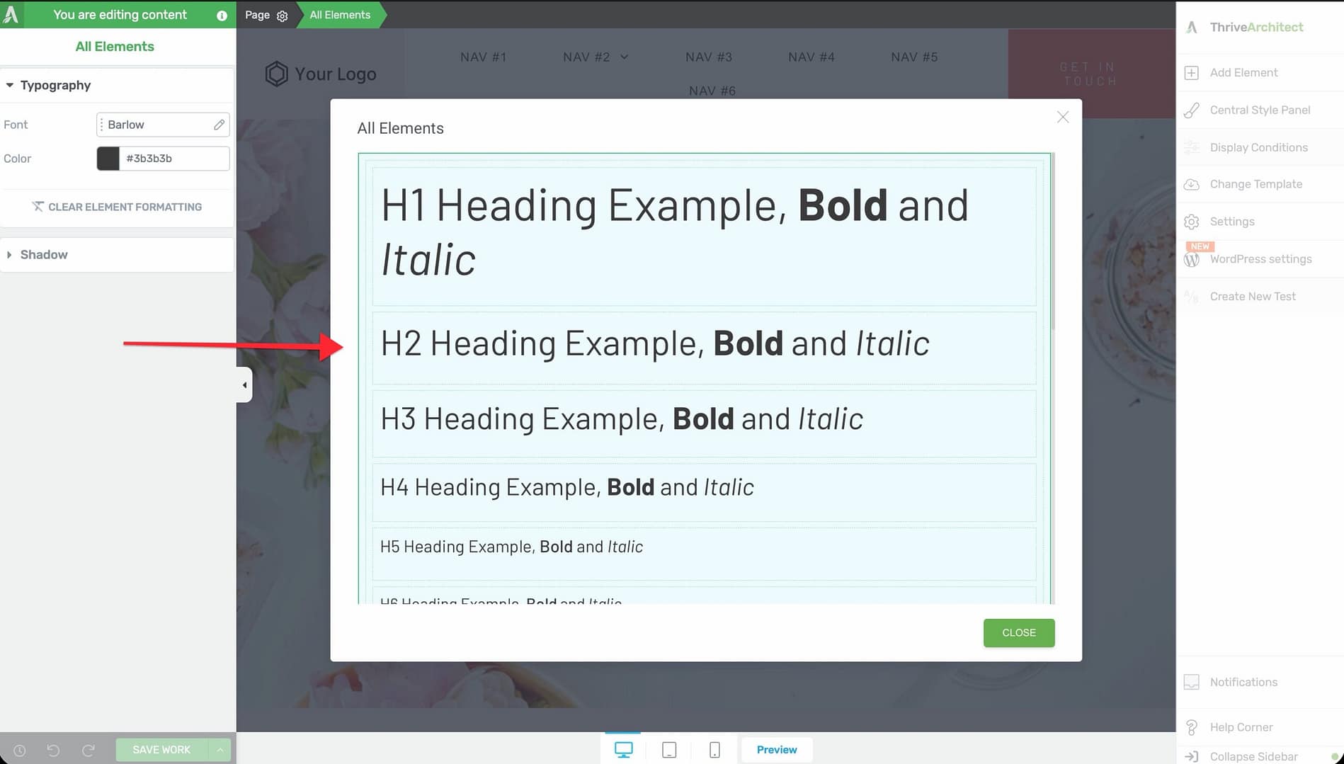 - When you change a typography setting (for example, changing all H2 headings to a new font), every H2 on the page that hasn’t been individually styled will update automatically.