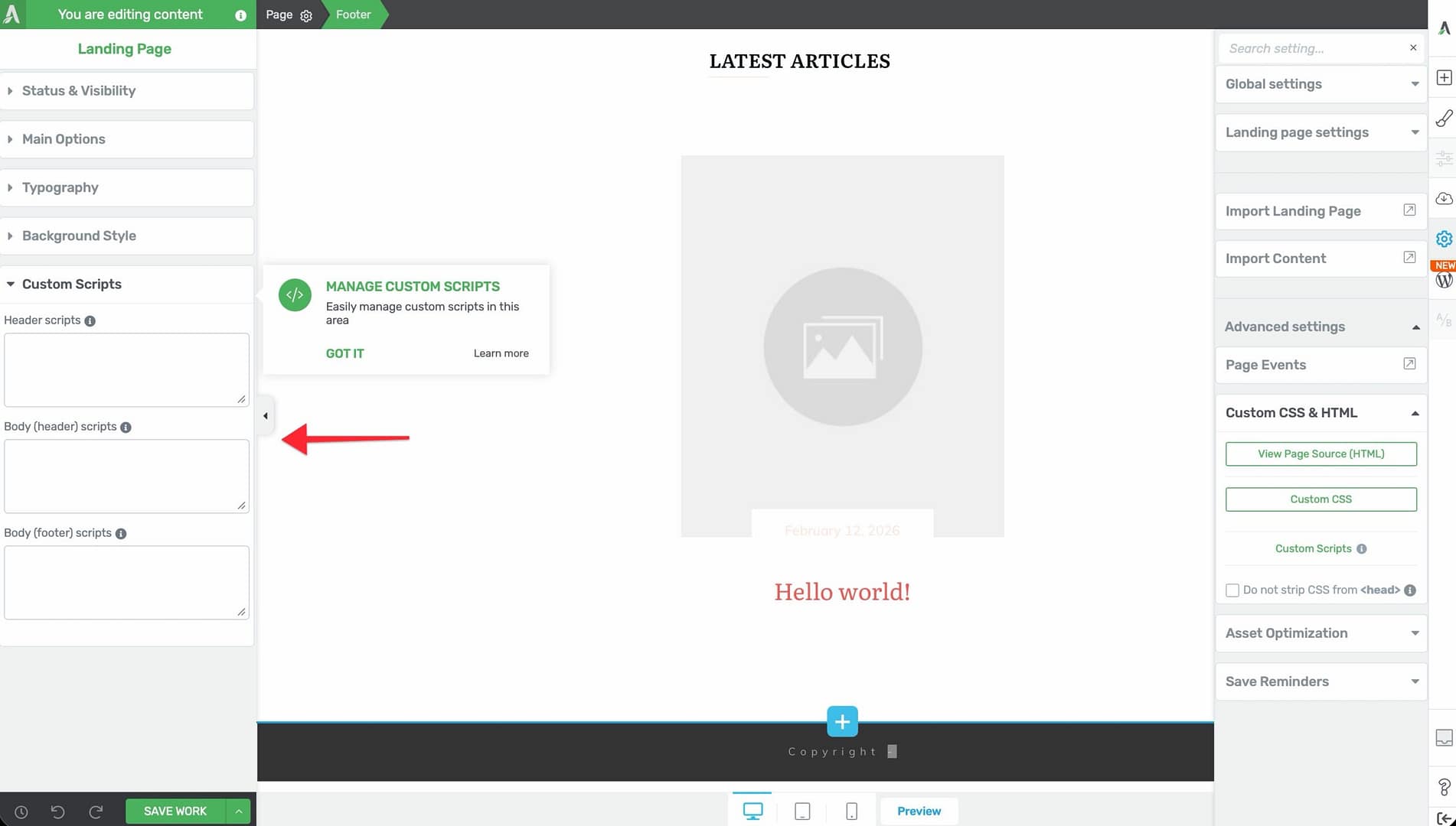 Note: For page-wide CSS changes that apply to all pages on your site, use the Custom CSS option in Thrive Dashboard > Global Settings instead of the landing page script manager.