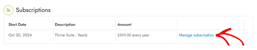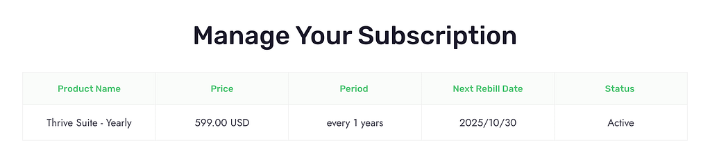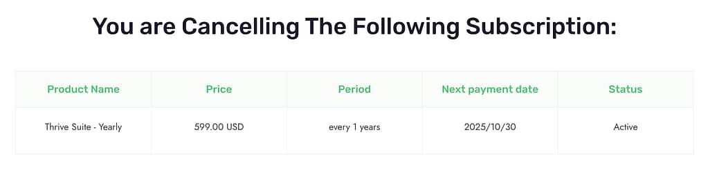 If you decide to cancel, your subscription will not renew next year, but you can still use Thrive Themes products until your current paid time runs out. You’ll see the renewal date in your account.