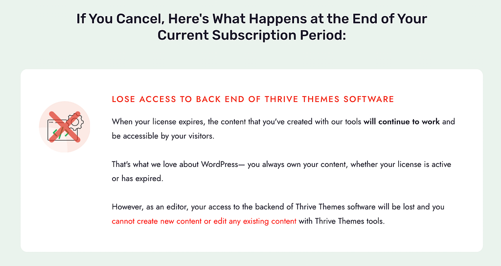 If you cancel your subscription, you will have to make a new purchase in order to access your account and use Thrive products on any new websites. You will also lose access to future updates and support after the license expires.