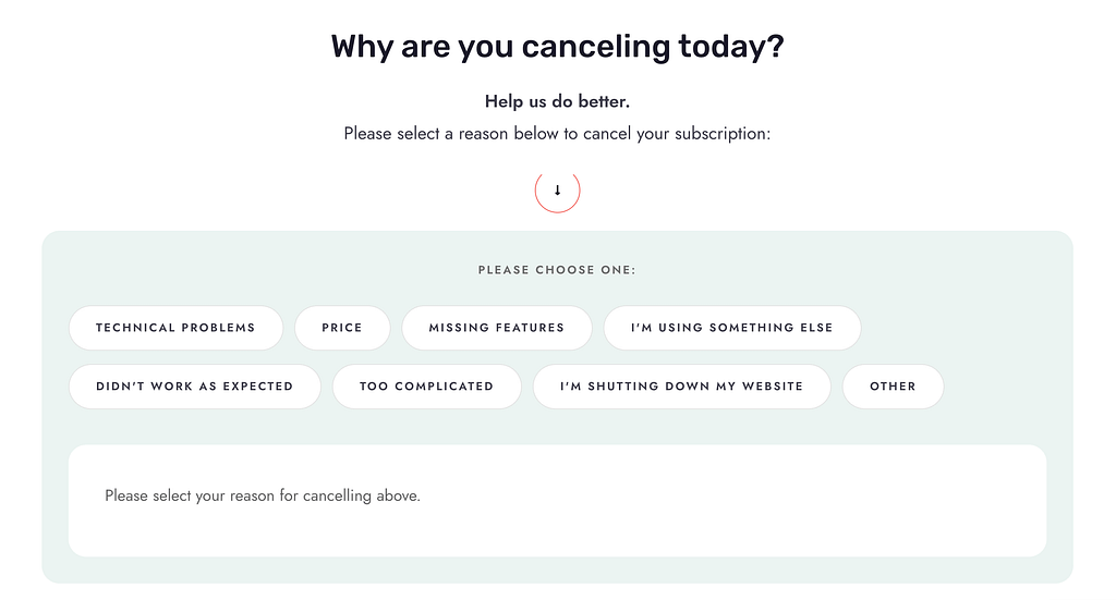 On this page, scroll down to the next section where you are asked to select a reason why you want to cancel the subscription.