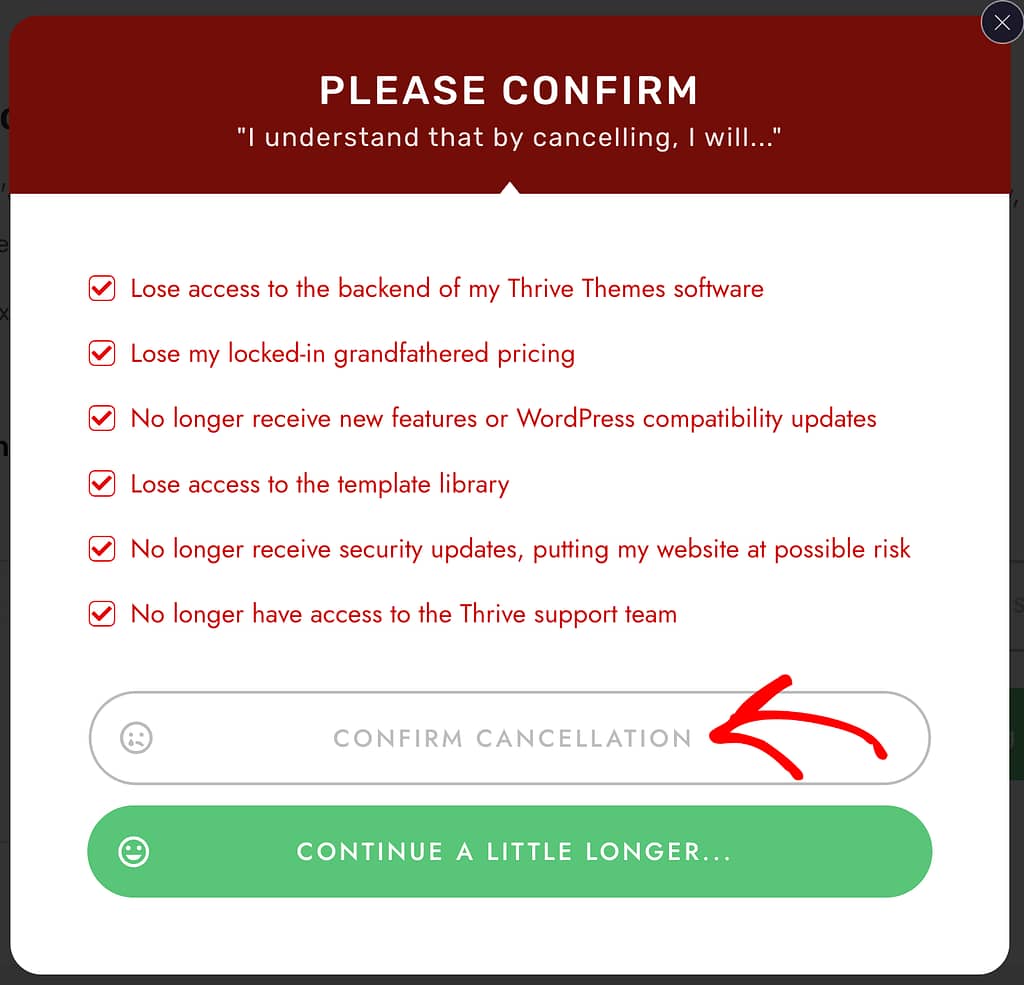 Clicking the button will open a popup with the list of things you’ll lose when you cancel the subscription. Check these to confirm and click the Confirm Cancellation button.