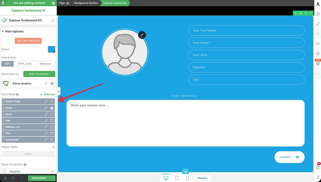 - Form Fields: Change the labels for Name, Email, and Testimonial text.