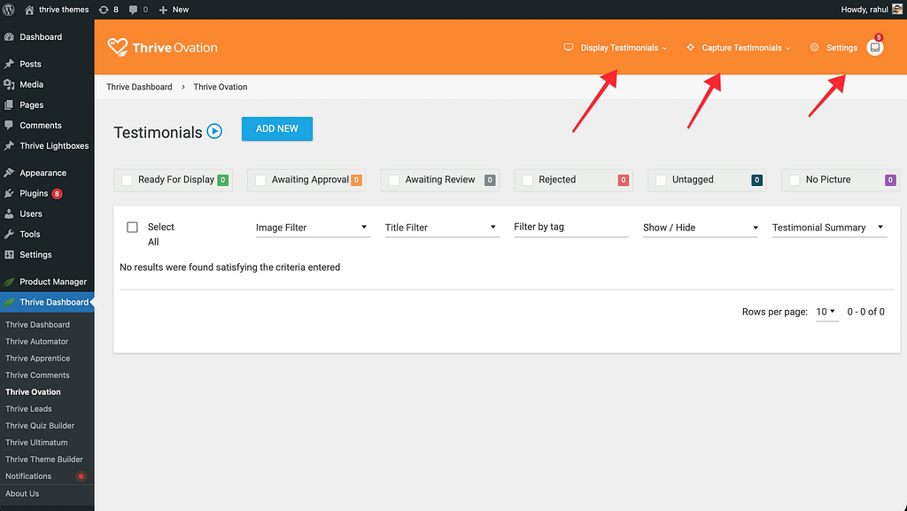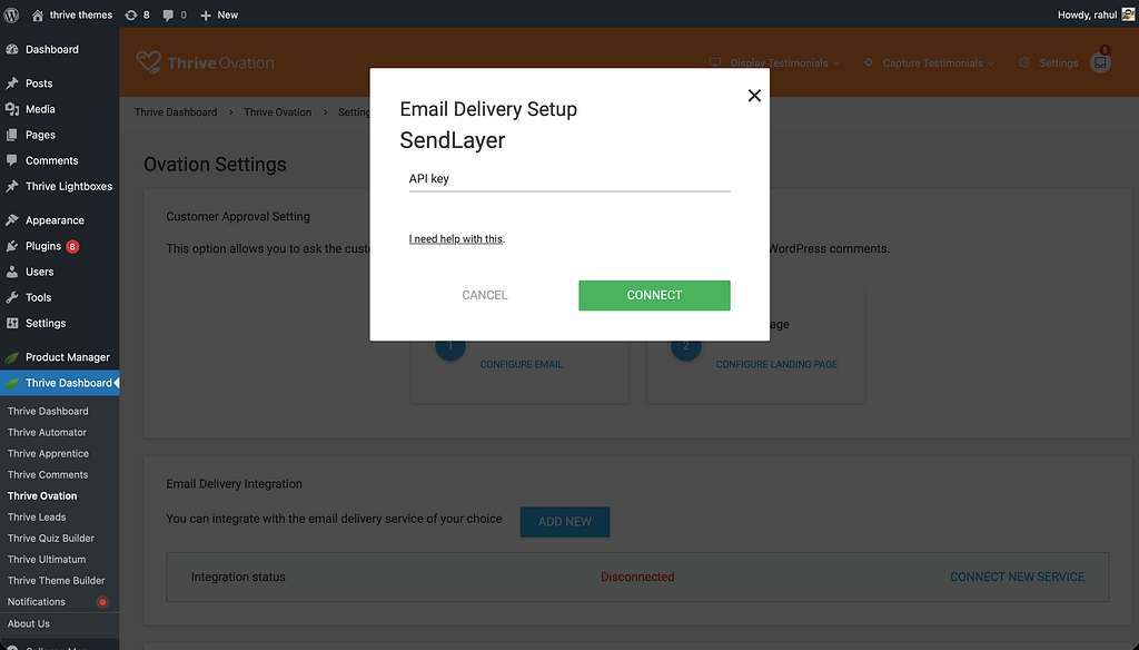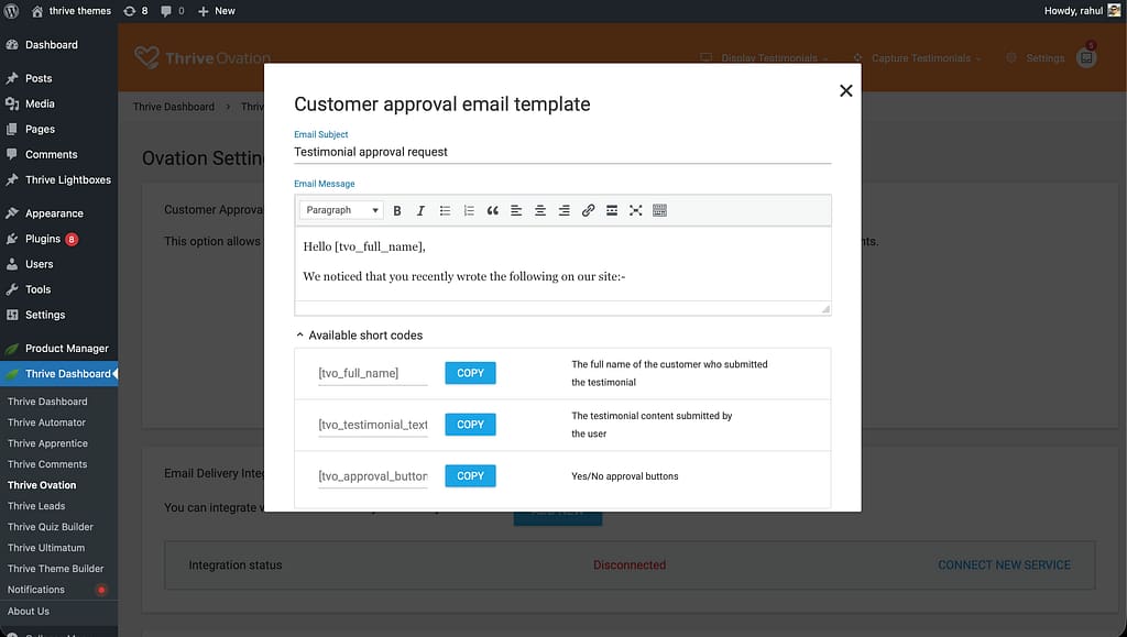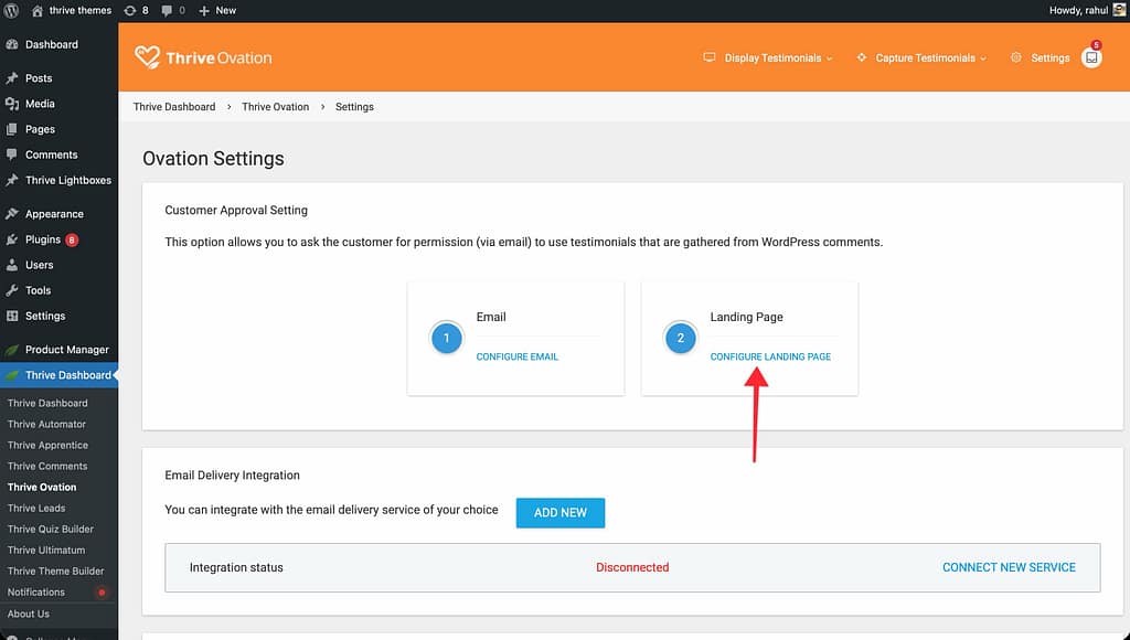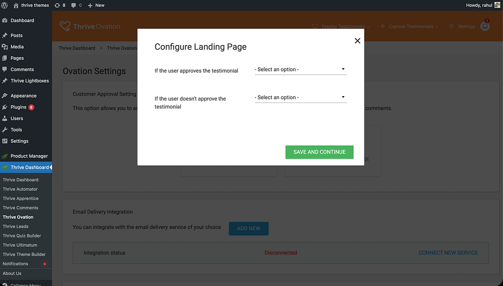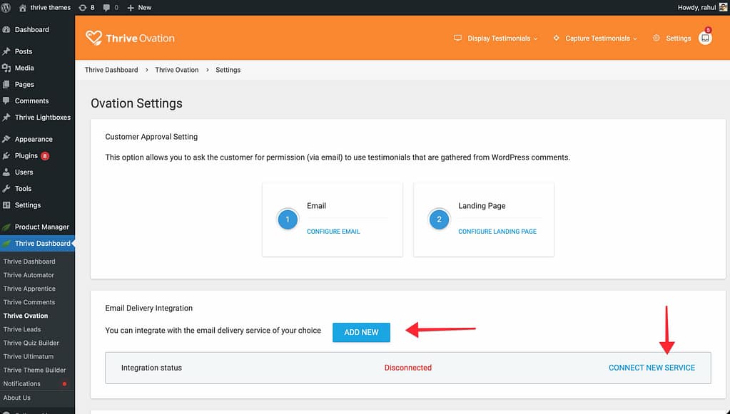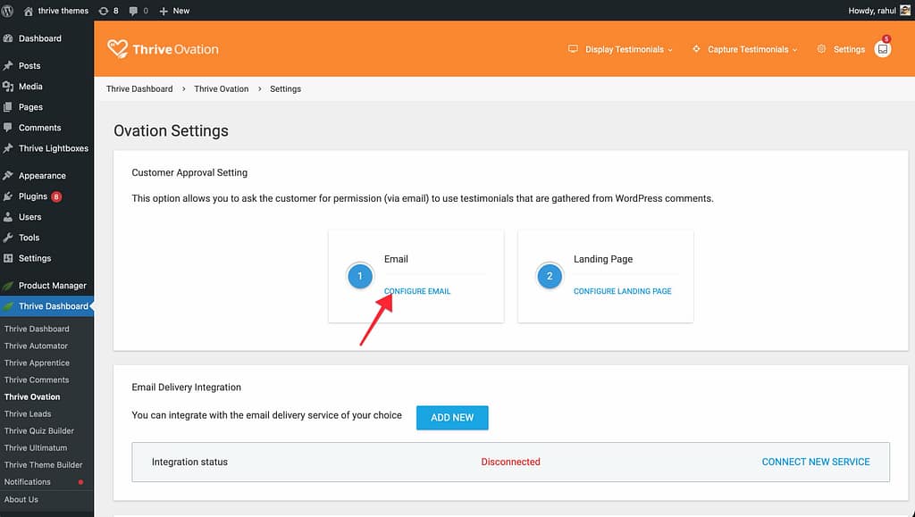 In this article, you’ll learn how to set up the backend “plumbing” for Thrive Ovation. This includes connecting an email delivery service and configuring the automated workflow used to request permission from your customers to use their testimonials.
