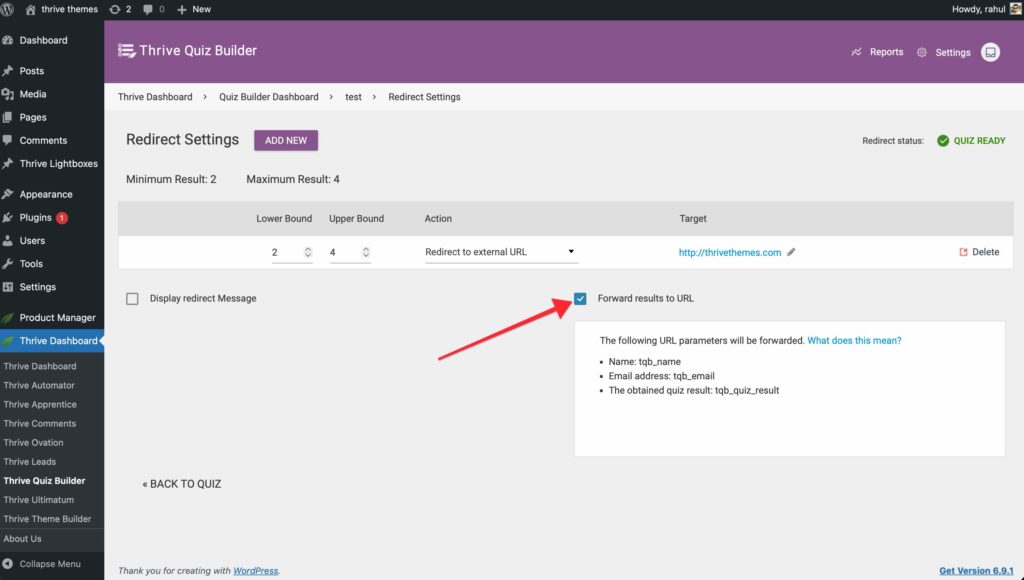 2. This will append the user’s score, category name, and other data to the end of the URL as query parameters (e.g., ?result=Beginner&score=42).