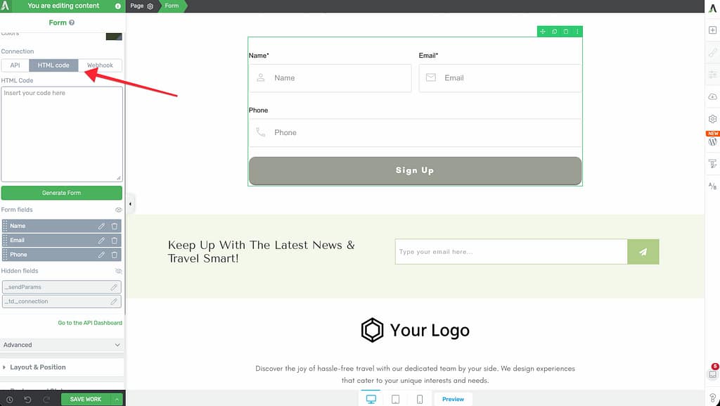 If your service isn’t supported via API, or you need to use a specific custom form setup, you can use the raw HTML code.