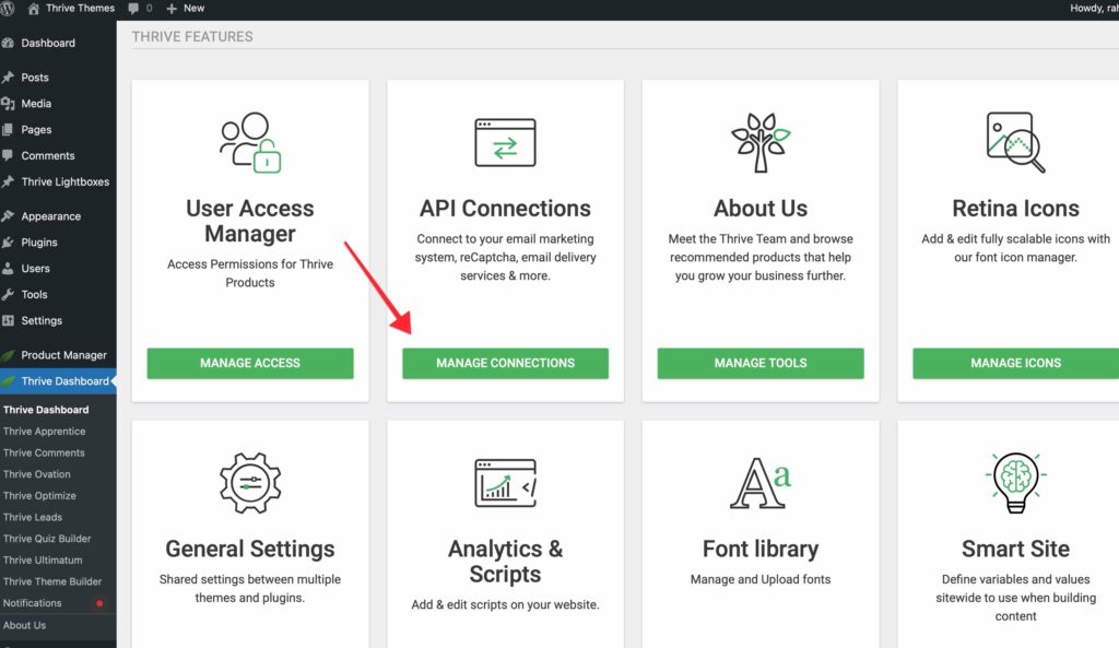 - Go to Thrive Dashboard > API Connections to set up the integration data globally.