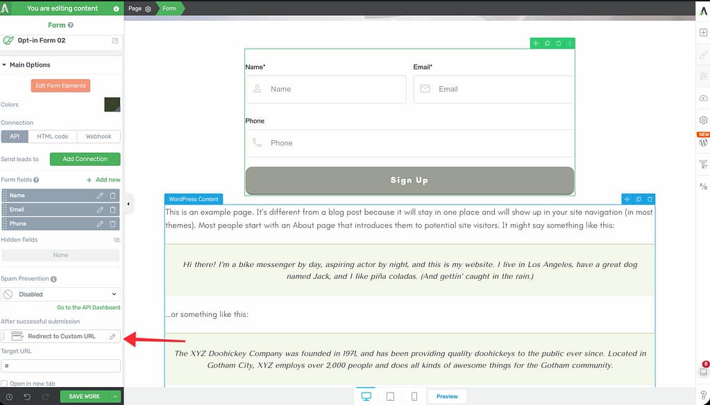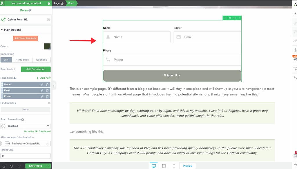 - Add a Lead Generation element to your page and connect it to your email marketing service.