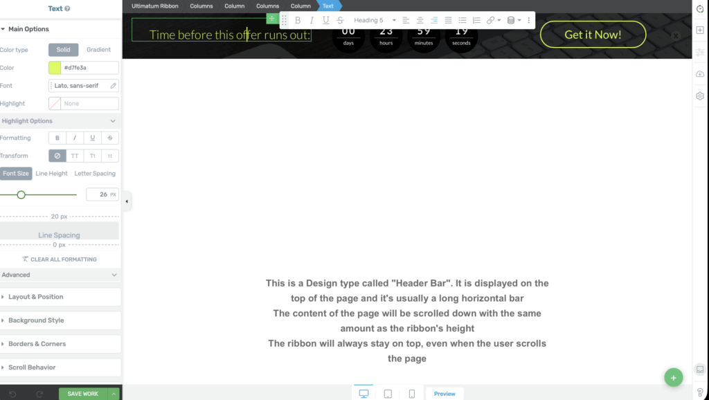 Thrive Ultimatum uses the Thrive Architect visual editor to customize your countdown timers and ribbons. This means you have full design control without writing code.