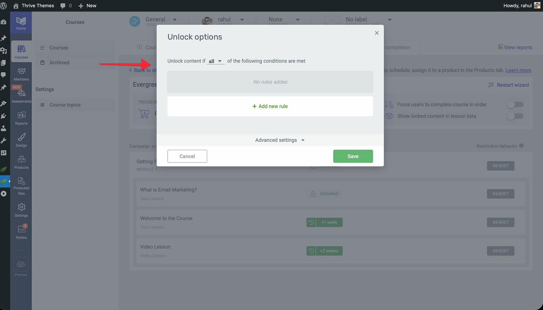 Unlock conditions let you customize when individual lessons or modules become available within your drip schedule. You can apply a single condition or combine multiple conditions for more complex scheduling.