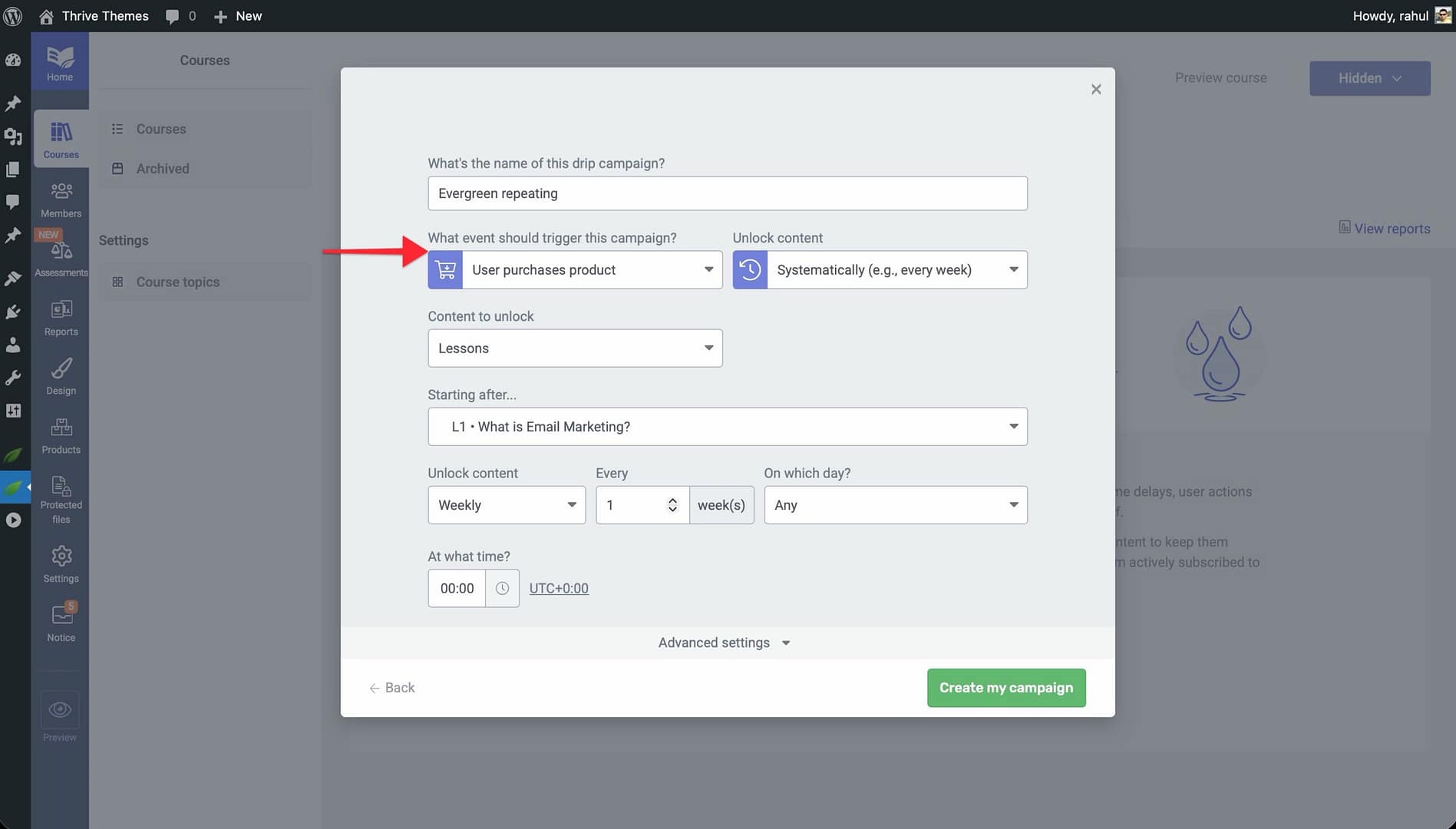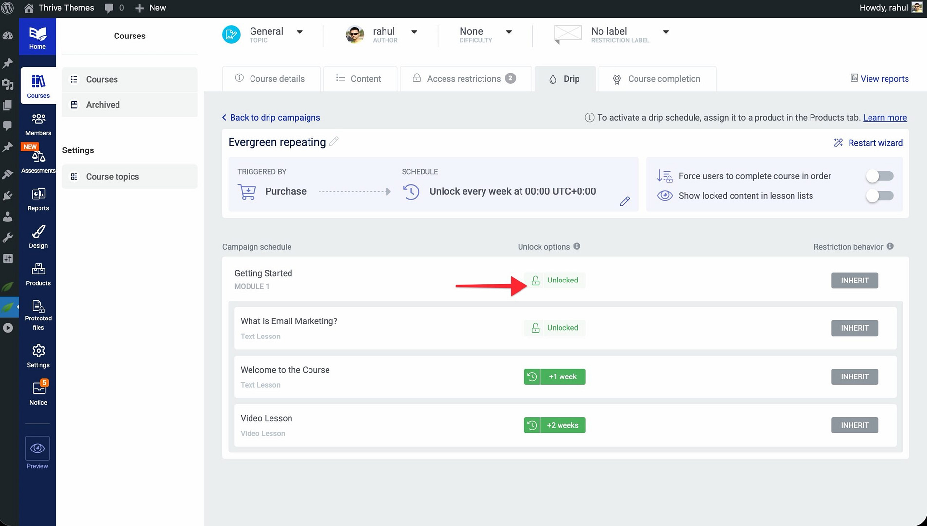 That’s it! You’ve successfully learned how drip content works in Thrive Apprentice, explored the available campaign templates, configured unlock conditions, and connected your drip schedule to a sellable product.