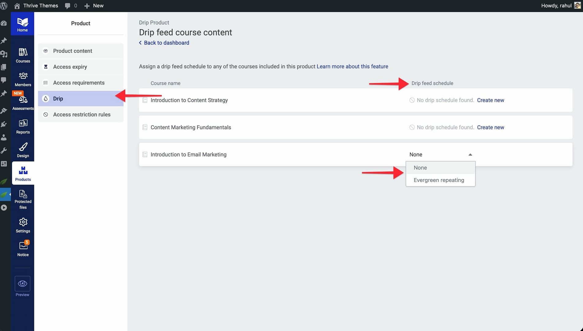 In this article, you’ll learn how to use drip content scheduling in Thrive Apprentice—what drip content is, how the drip system works, which campaign templates are available, how to configure unlock conditions, and how to sell a dripped course using Products.
