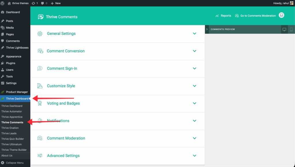 The Thrive Comments dashboard is your control center for managing all comment-related features. Here’s an overview of the main sections you’ll use: