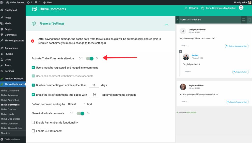 The first and most important toggle—this activates Thrive Comments across your entire website.