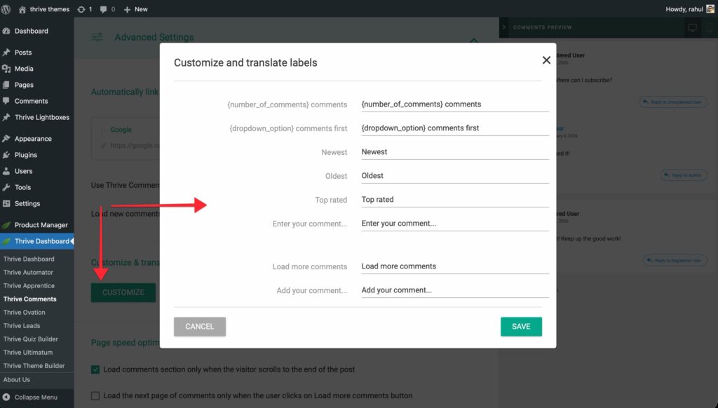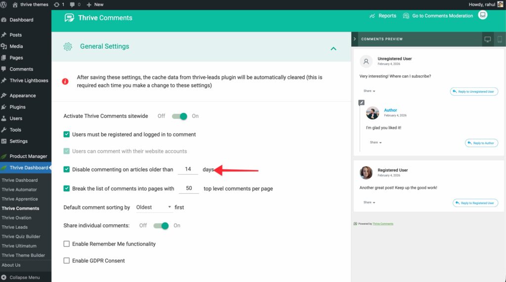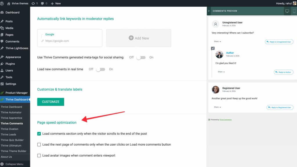 - This opens the main Thrive Comments dashboard where you’ll configure all features.