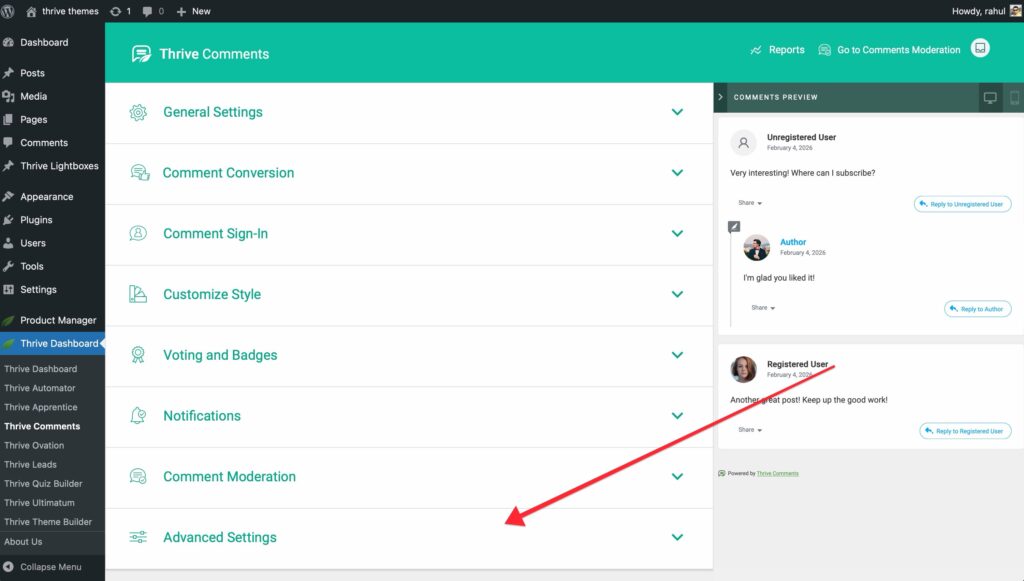From the Thrive Comments dashboard, click on Advanced Settings.