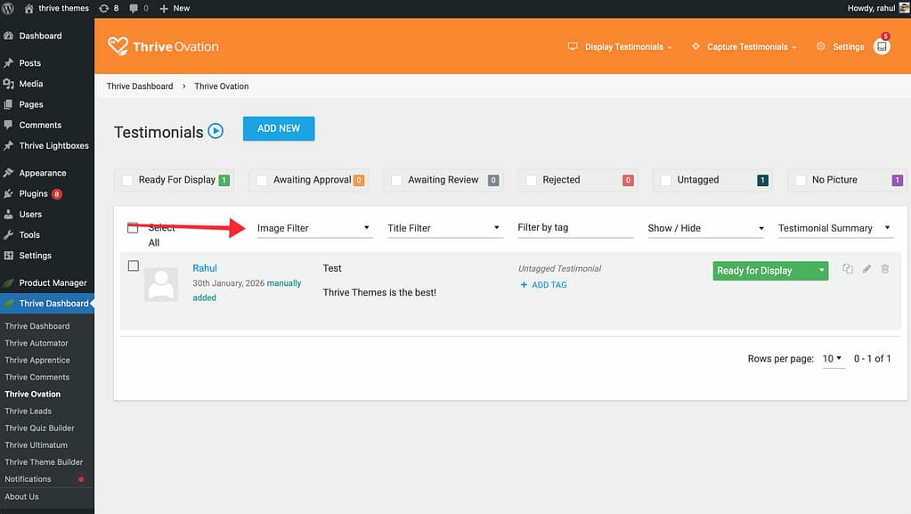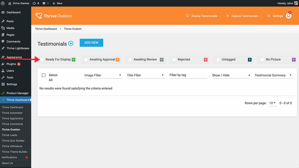 - Awaiting Approval: Testimonials created from WordPress comments where you are still waiting for the customer’s permission to use them.