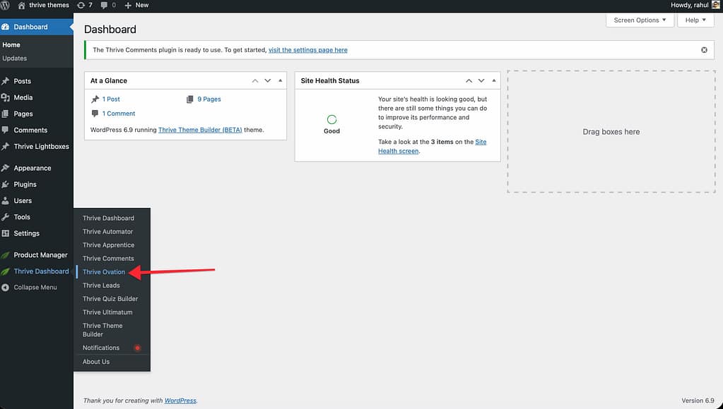 You can find the Thrive Ovation dashboard by navigating to the Thrive Dashboard menu in your WordPress admin sidebar and selecting Thrive Ovation.