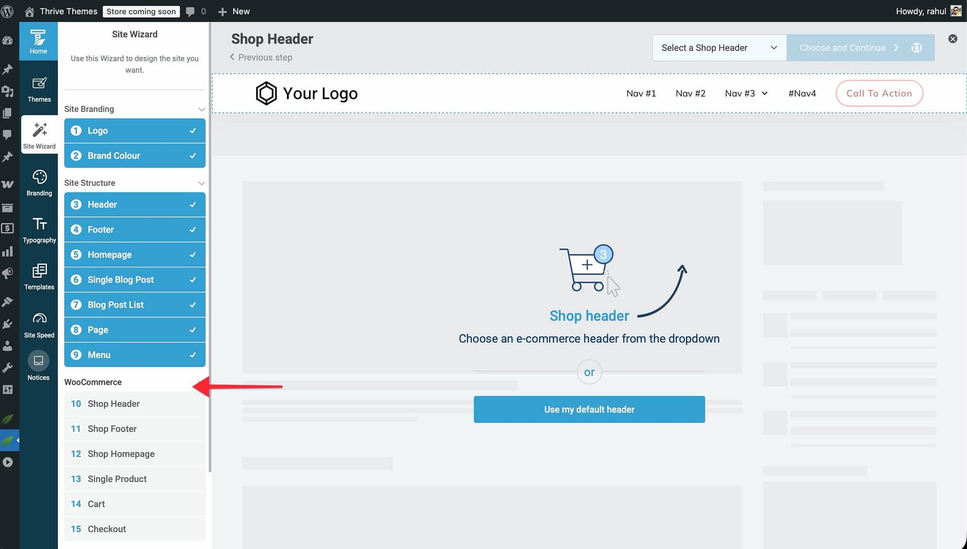 When you run the Site Wizard with WooCommerce active, a WooCommerce-specific setup step appears at the end. During this step, WooCommerce templates are automatically downloaded and configured.